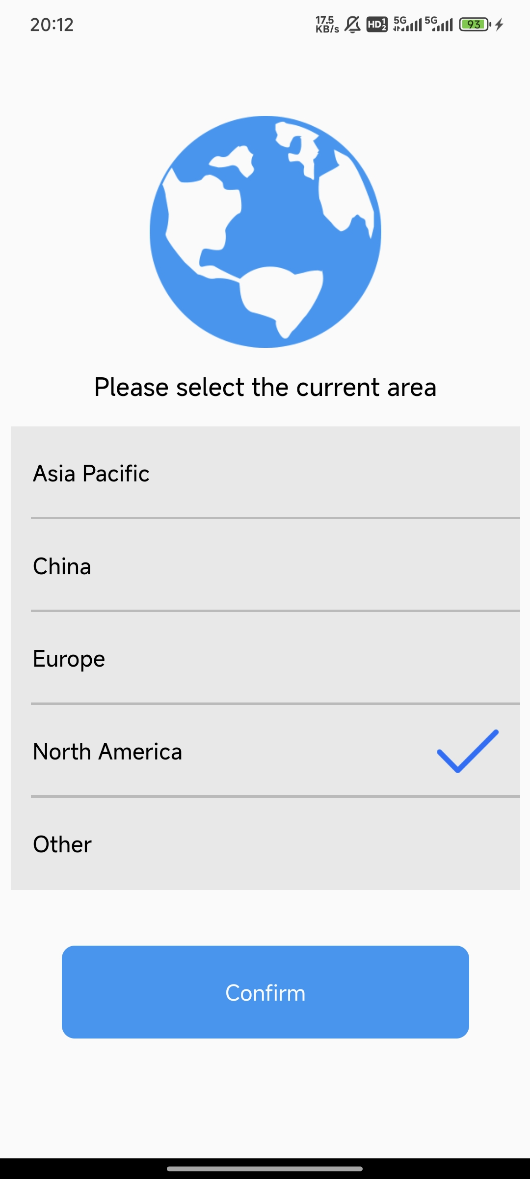 Note: Region selection affects server connection and device pairing.
