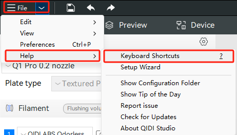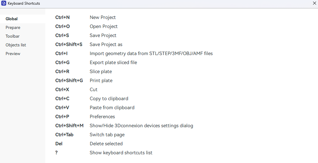 We have configured QIDI Studio with the following keyboard shortcuts for your convenience: