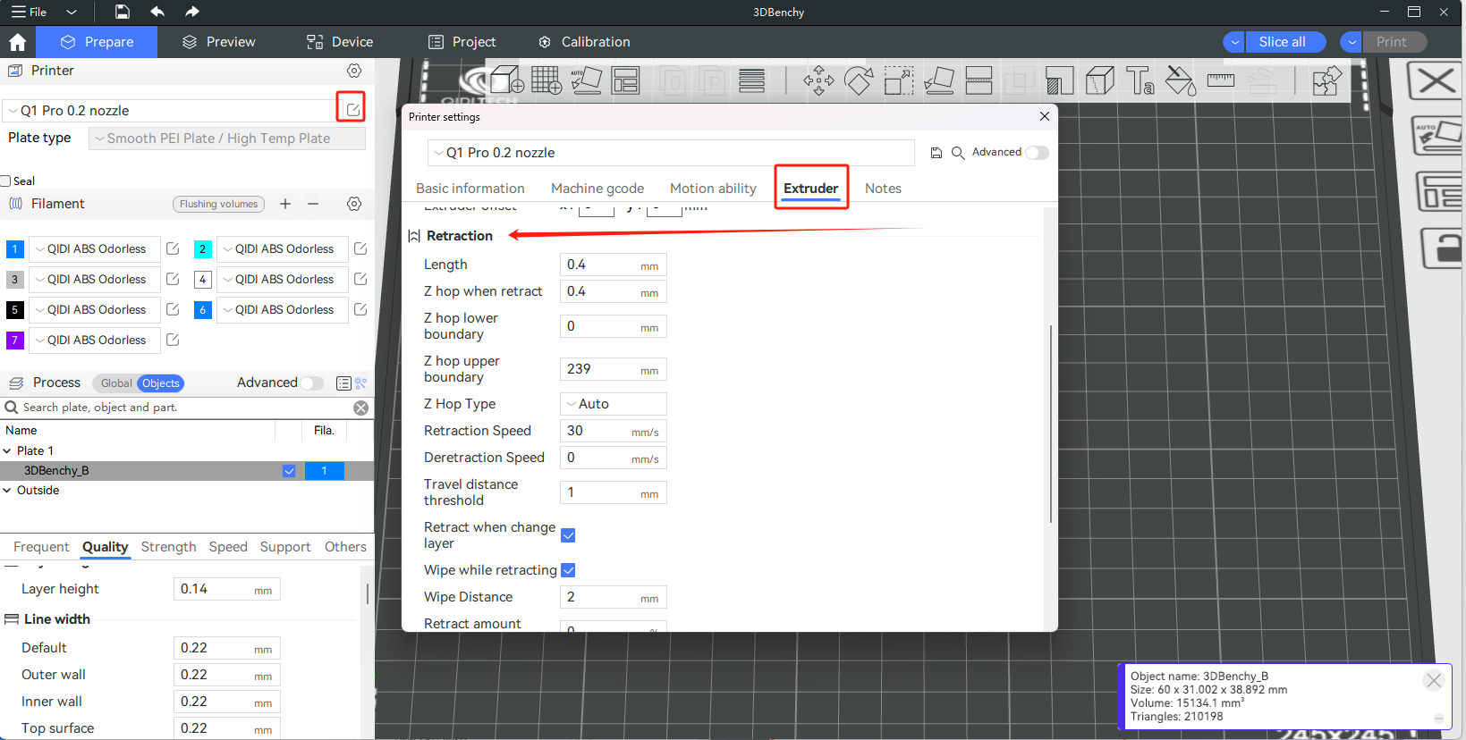 You can enable the retraction and set detailed parameters in the Printer Settings and Filament Settings. The parameters of the retraction can be set in the Printer Settings - Extruder.