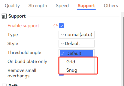 Both normal and tree supports have different styles to further adjust the final support structure. Normal support has two styles: