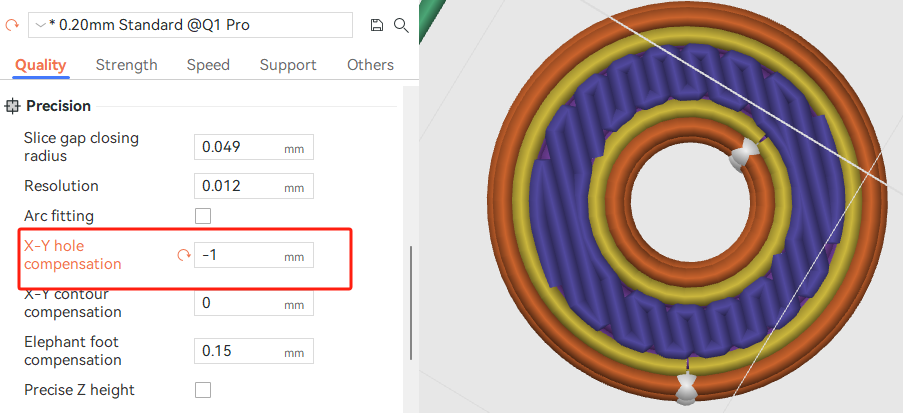 Hole compensation can add a compensation amount for each hole in each layer of the XY plane. When printing holes, the nozzle may drag some material toward the center of the circle, causing the actual printed hole to be slightly smaller than its intended value. If a hole is measured to be 0.5 mm too small, a suitable size hole can be printed with compensation of +0.25 mm.