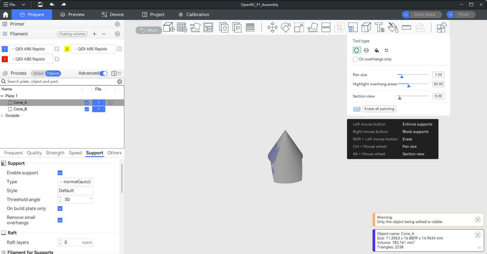 Select the model, click on "Supports painting," choose a drawing tool, and after setting the drawing parameters, proceed to draw supports on the model.