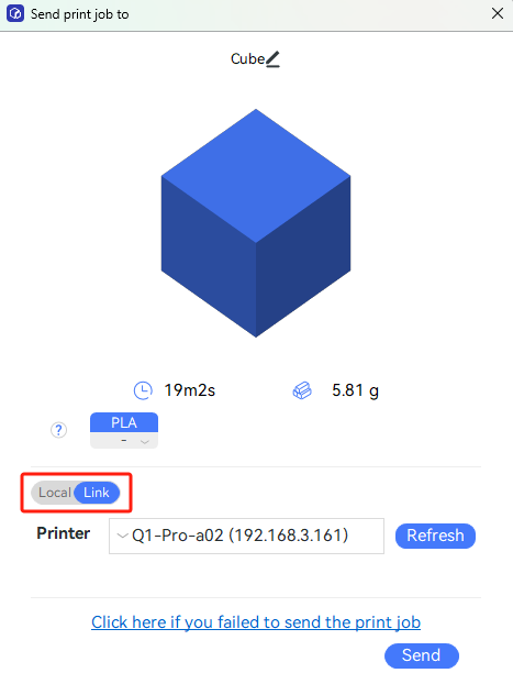Then, select "Link" on the "Print plate"/"Send" page, and select the corresponding printer for task send.