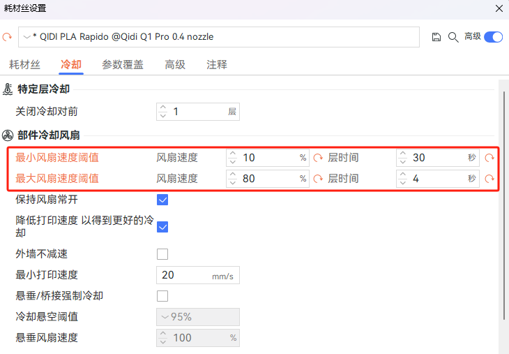 部分冷却风扇的速度根据层打印时间而变化。它由两个速度阈值和两个层时间阈值控制。