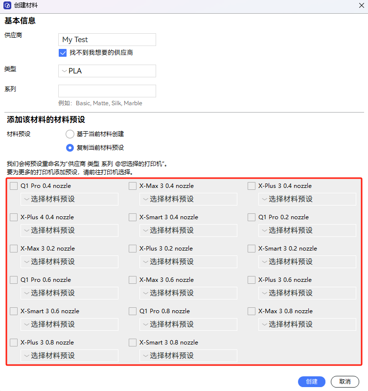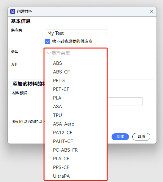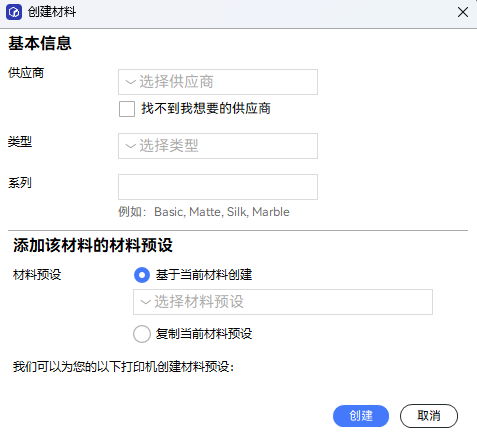 在”创建材料“的弹窗里填入耗材的基本信息,点击创建之后。您自定义的耗材就被成功创建了。