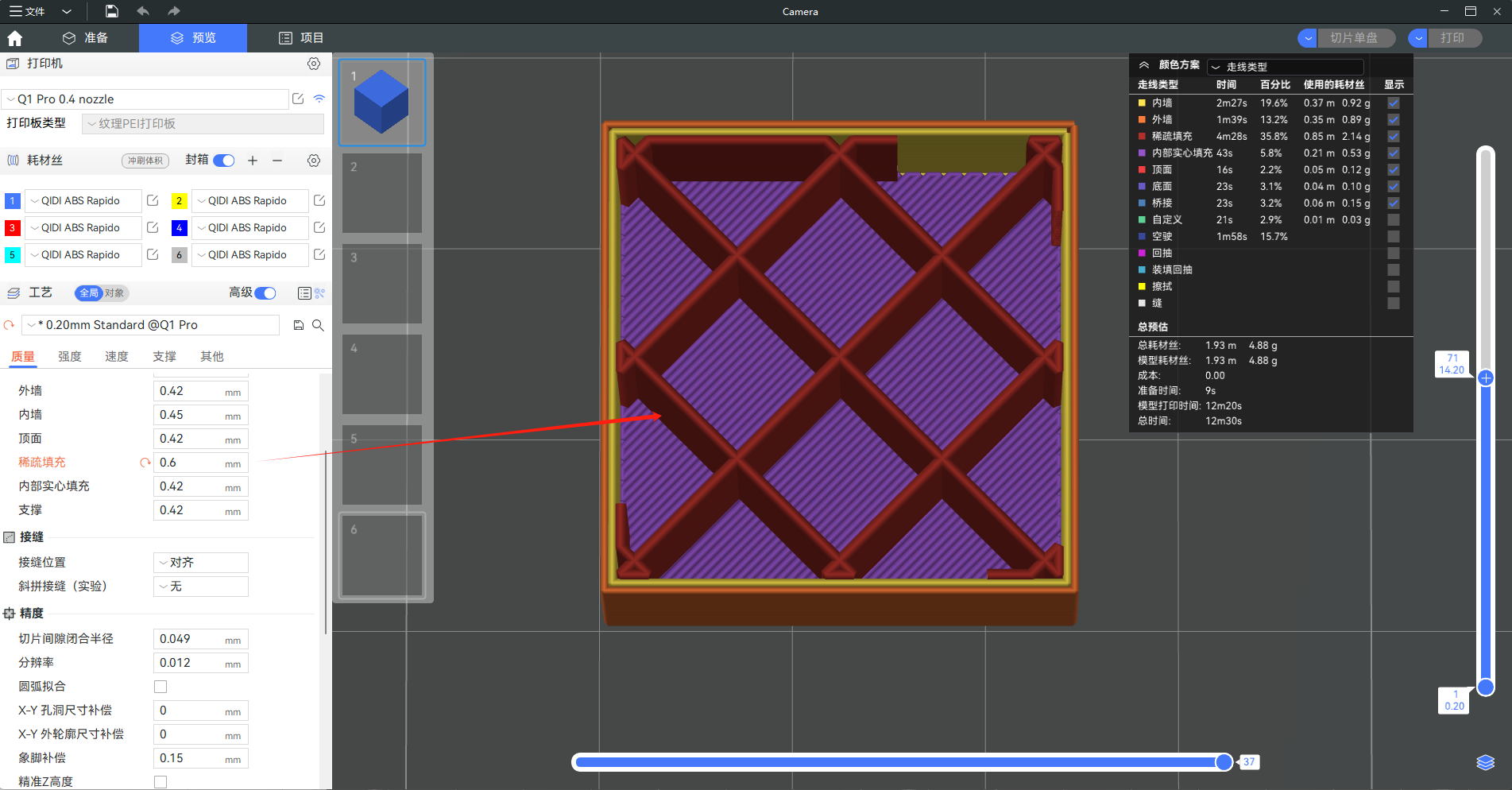 所有稀疏填充走线的线宽。除了顶壳和底壳层外,其它层中只要有大于“稀疏填充最小阈值”的填充区域,都属于稀疏填充。