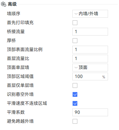 在QIDI Studio中,您可以通过工艺--质量--高级对质量相关的参数进行一些高级设置。(其中部分参数需要在偏好中开启开发者模式之后才会显示)。
