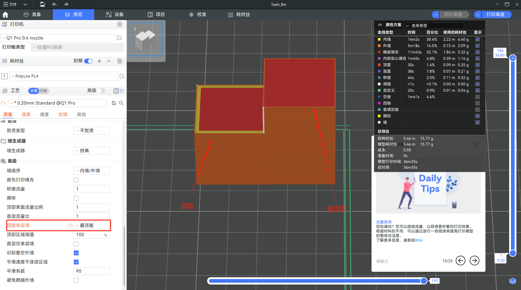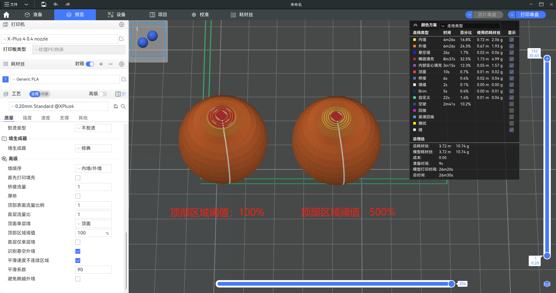 这个设置可以用于避免在狭窄顶面(通常非最顶面)触发顶面单层墙。这个值代表着线宽的百分比。放大这个值之后,比较小的顶面区域会被筛掉,仍然按照设置的墙层数来生成。但是,此选项对最顶面不生效。