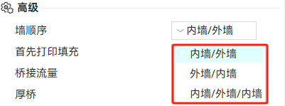 该参数分为三个选项:内墙/外墙、外墙/内墙、内墙/外墙/内墙。可以通过设置该参数调整模型墙的打印顺序。