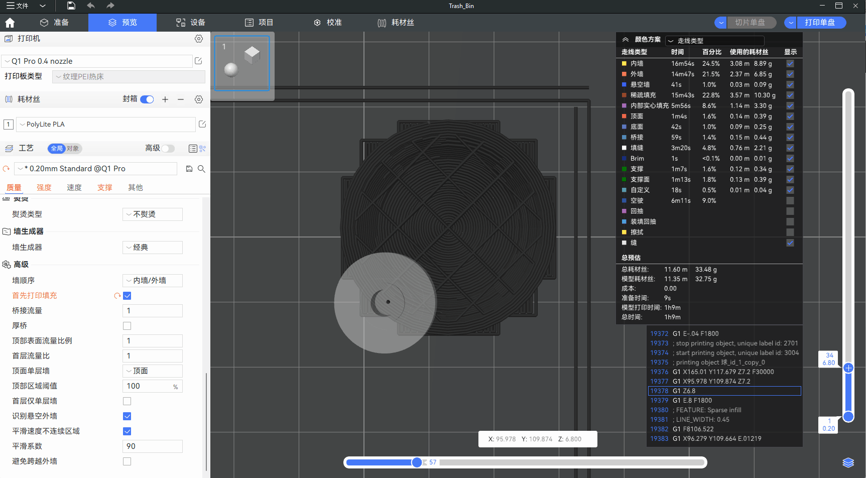 适当调整平滑系数可以使得悬垂区域的打印质量更好,建议在1~200范围内进行调整。