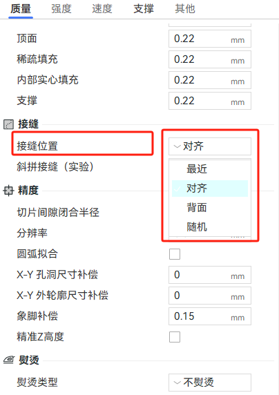 将斜拼接缝延伸至整个围墙。此选项开启需要慎重,整圈都使用较小的挤出量挤出可能会引发材料粘连不良,导致外观瑕疵,甚至打印失败。