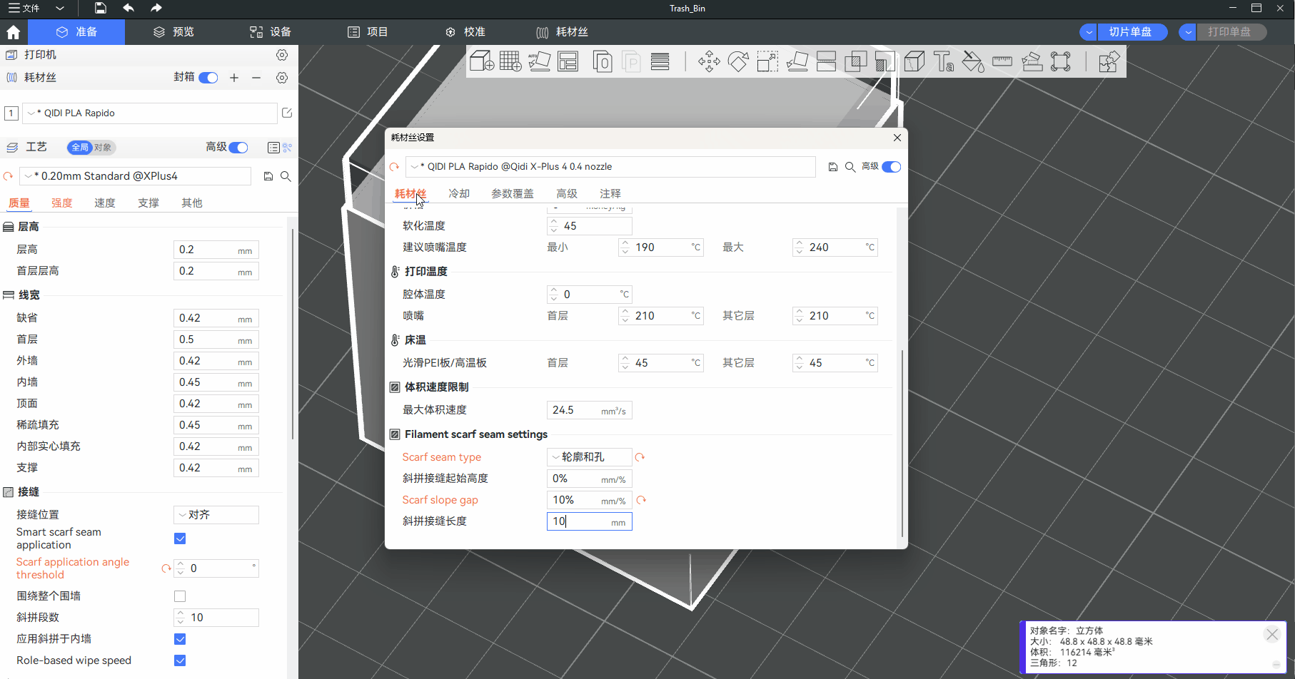 可以在耗材丝设置中针对不同耗材设置是否启用斜拼接缝。