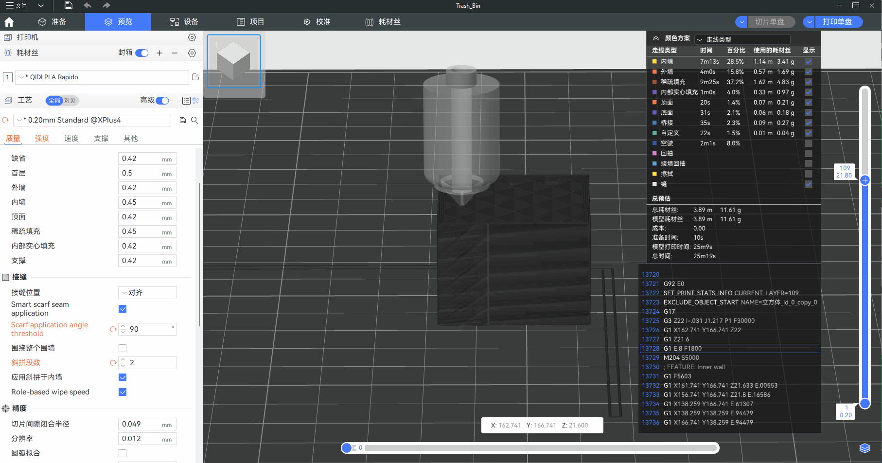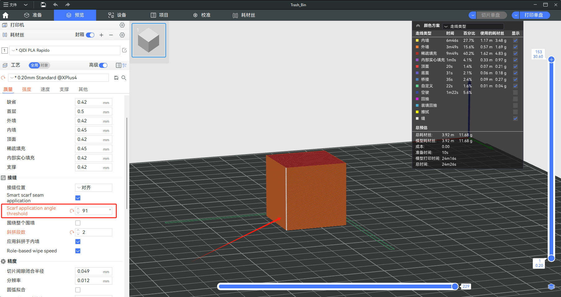 QIDI Studio具备智能选择接缝功能,根据模型的特点来选择是否应用斜拼接缝。当接缝位置的悬垂过大时,当接缝位置角度较小可以隐藏接缝时,均会选择不应用斜拼接缝。