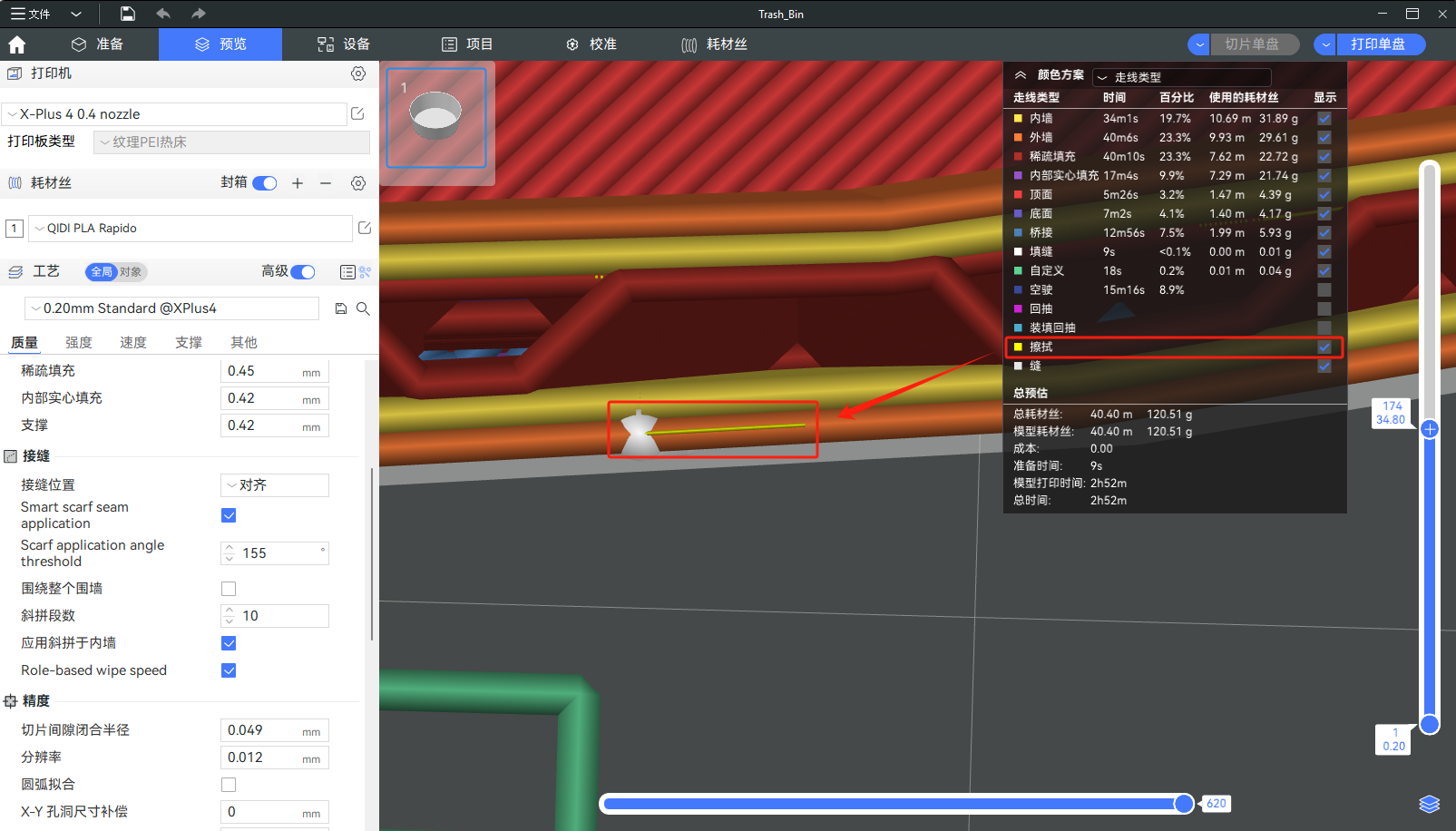 勾选“自动擦拭速度”后,擦拭速度由当前走线类型的打印速度决定。