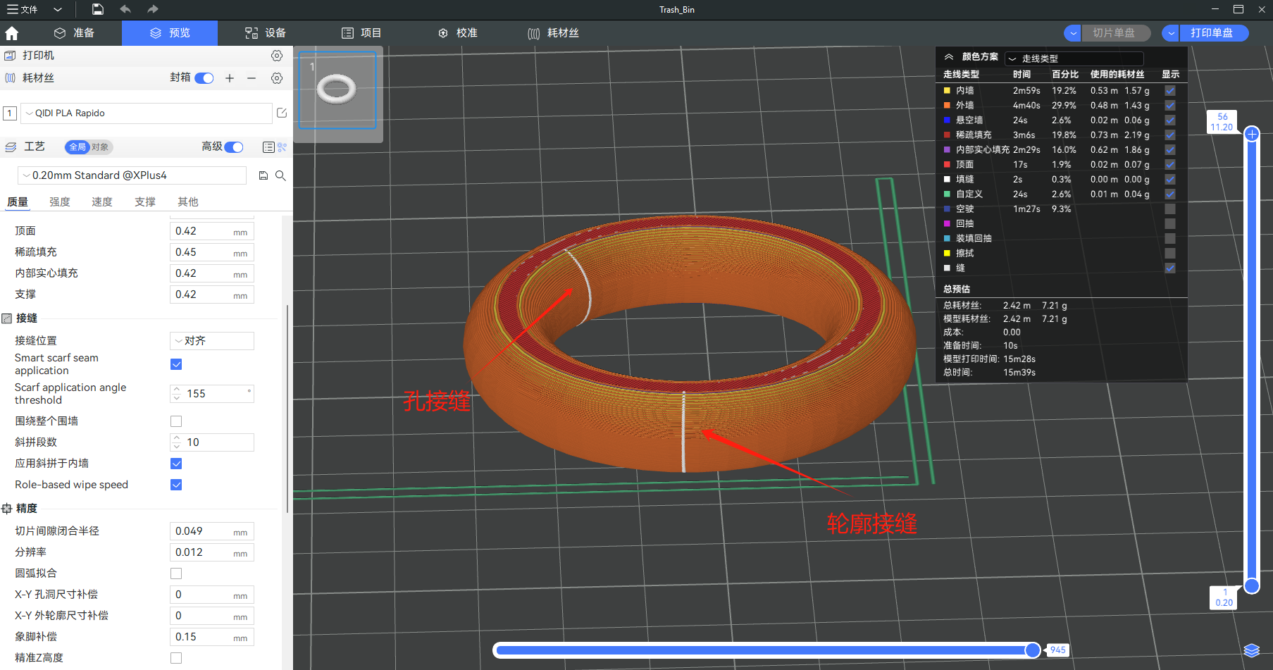 如下图所示,通过控制接缝起始点的喷嘴高度和挤出量,让接缝的起始点和结束点的位置结合得更加严密。