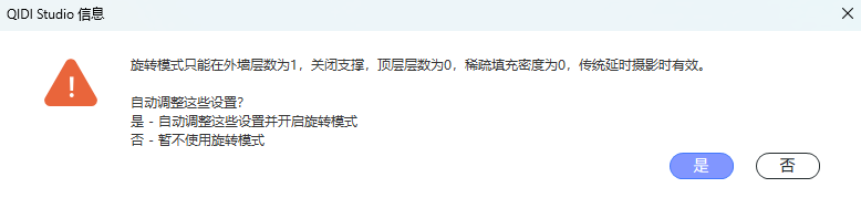 当您确认要启用螺旋花瓶模式时,它会自动调整设置,将外壁层设置为 1,将顶壳层设置为 0,将稀疏填充密度设置为 0%。