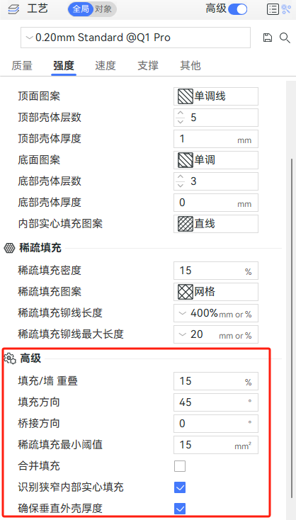 您可以在工艺 - 强度 - 高级中设置一些与强度相关的高级参数。