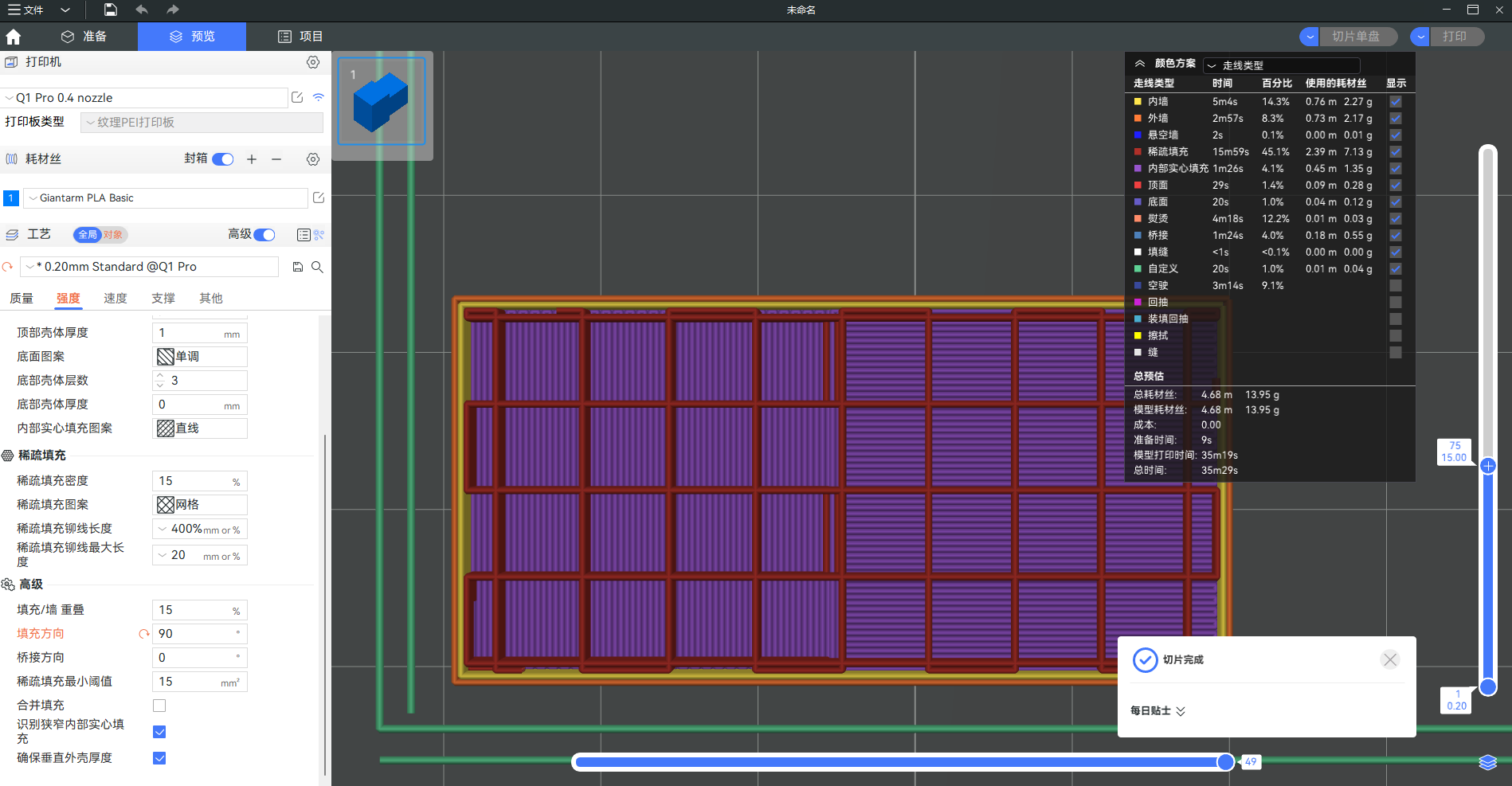 稀疏填充图案的角度,用于控制线条的起点或主方向。此参数还调整所有填充线的方向,包括顶面、底面、稀疏填充和内部实体填充(桥除外)。