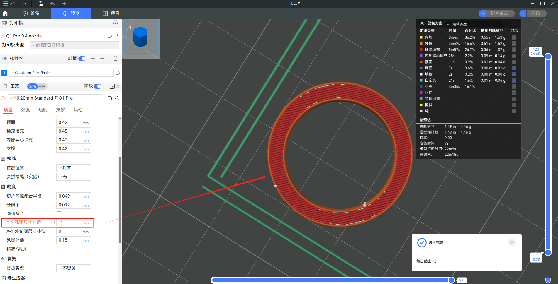 当您打印一些需要组装的零件时,有时会因为材料的收缩等因素而打印零件的尺寸不正确,因此零件无法很好地贴合。QIDI Studio 中的 XY 孔/轮廓补偿功能可以适当补偿由误差引起的间隙。您可以在“工艺 - 质量”中启用此功能: