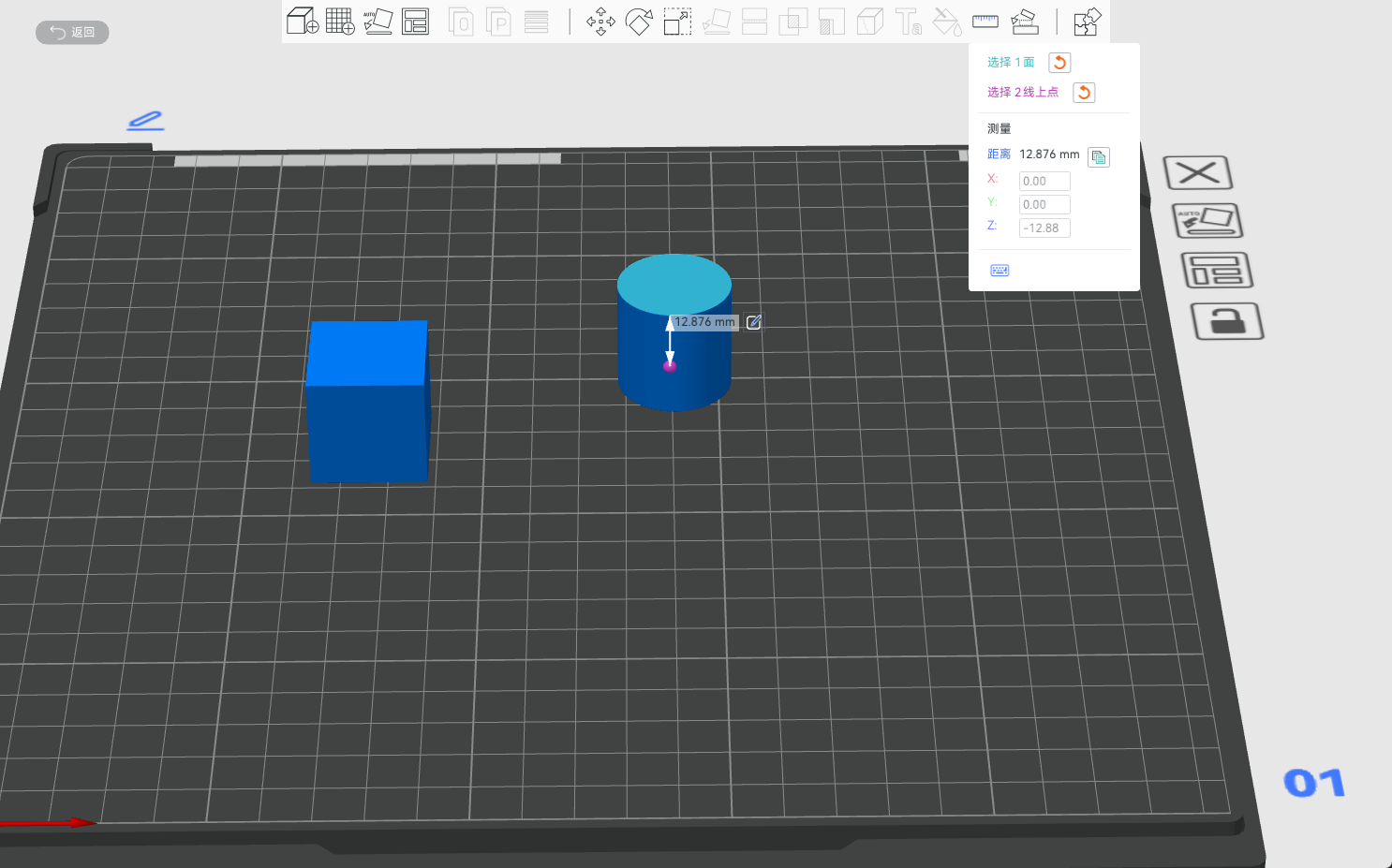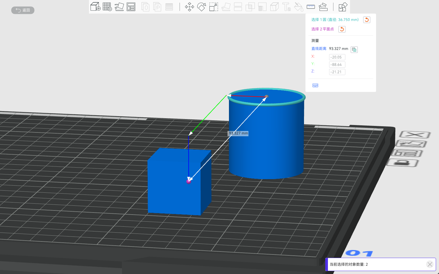 要测量两个对象之间的角度和距离,您需要首先通过 Ctrl + 鼠标左键选择它们,再点击”测量“按钮,选择您想要测量的内容后,软件会自动计算并显示之间的距离与角度。