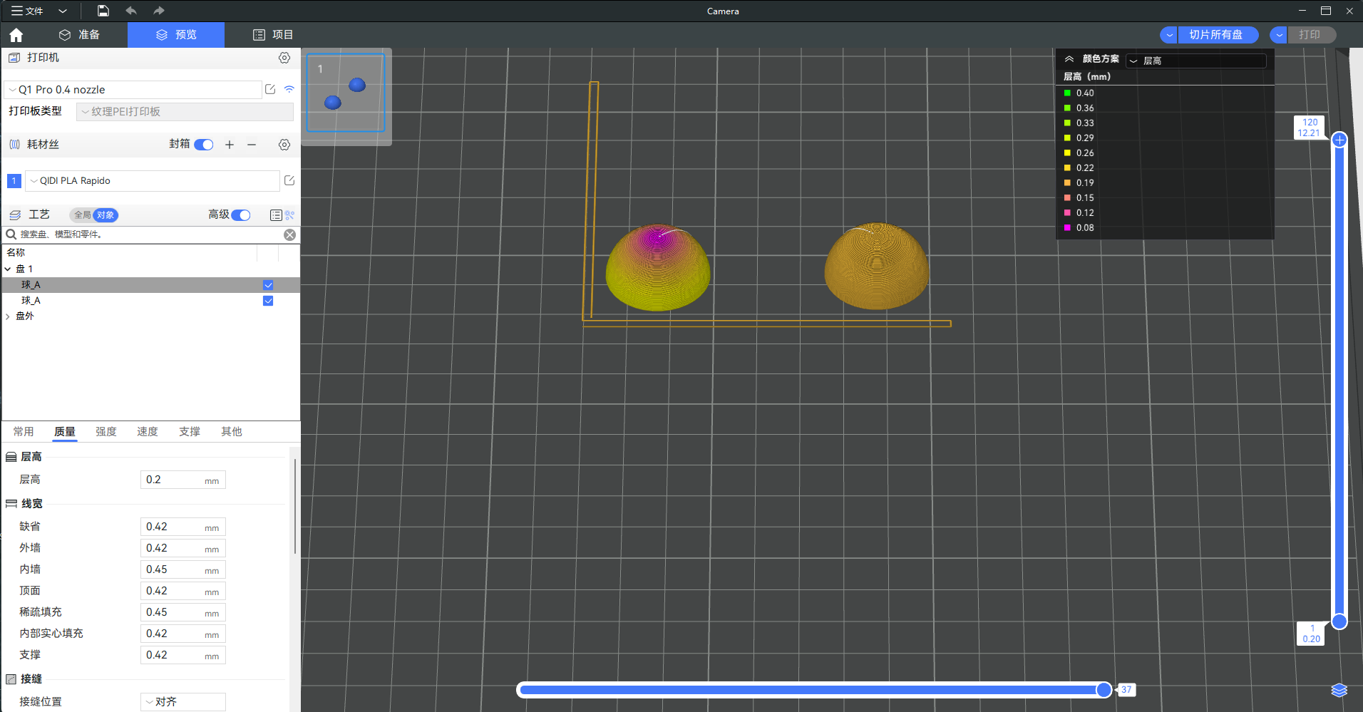 通常,在工艺预设中设置打印高度后,切片软件会使用一个统一的层高对模型进行切片。但有时对于一些特殊的模型,如球形顶部或带有弧面的模型,打印的结果的表面可能会不够光滑,模型表面的“阶梯感”会比较明显。