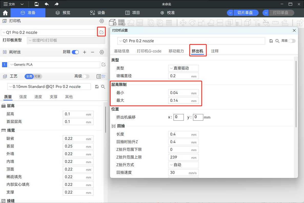 可变层高的高度范围在打印机设置的层高限制中,例如0.4mm喷嘴的层高范围是0.08-0.28,这是我们通过大量实现测得该喷嘴能够打印出较好质量的一个层高范围,通常我们不建议您修改它。