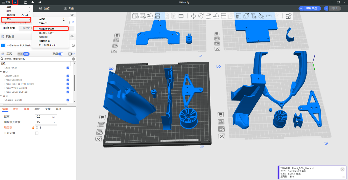 运行QIDI Studio,点击“∨”图标,然后点击“帮助”--“显示配置文件夹”,可以在弹窗中看到日志文件夹。